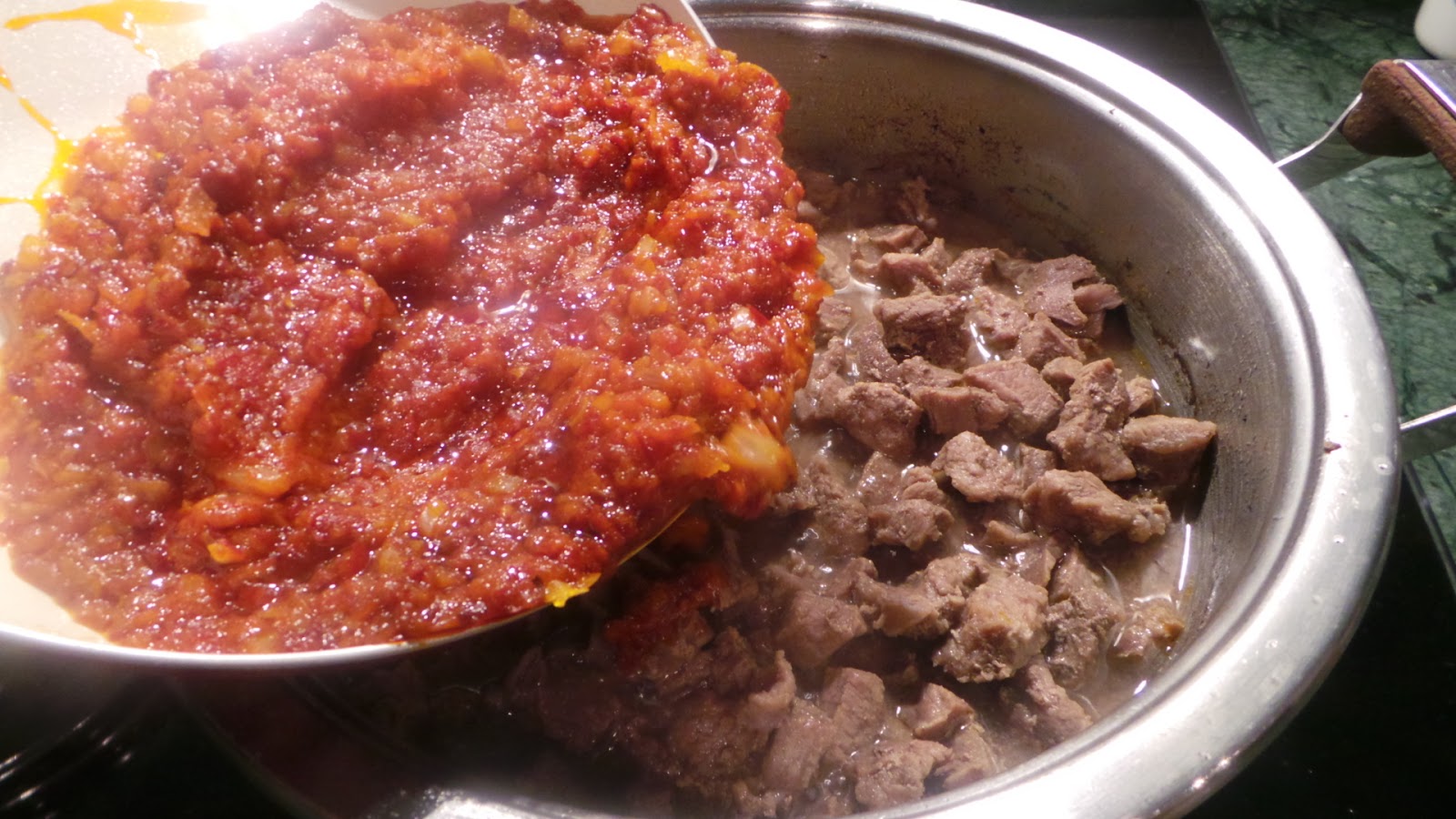 Pişen etlerin içinden biraz su alıp,salçaların olduğu yere su ilavesi yapın.Karıştırın.
